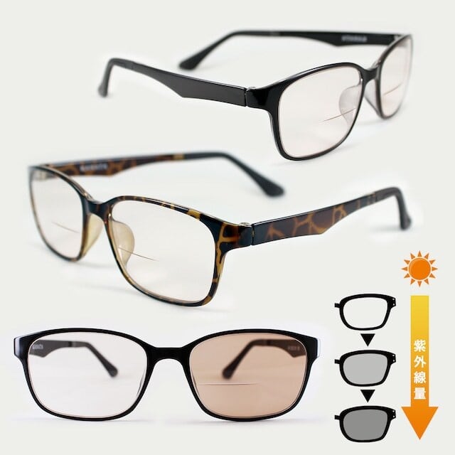 ハイブリッドリーディンググラス 老眼鏡 調光レンズ 遠近両用 バイフォーカル 二重焦点 ブルーライトカット 紫外線 UVカット アイケア 屋内 屋外 男性 紳士 メンズ ダンディ かっこいい おしゃれ 日本光材 glass_NO43