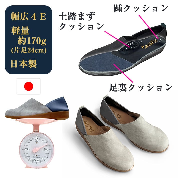 4E ワイズで幅広設計、なのにスタイリッシュなスリッポンデザイン。