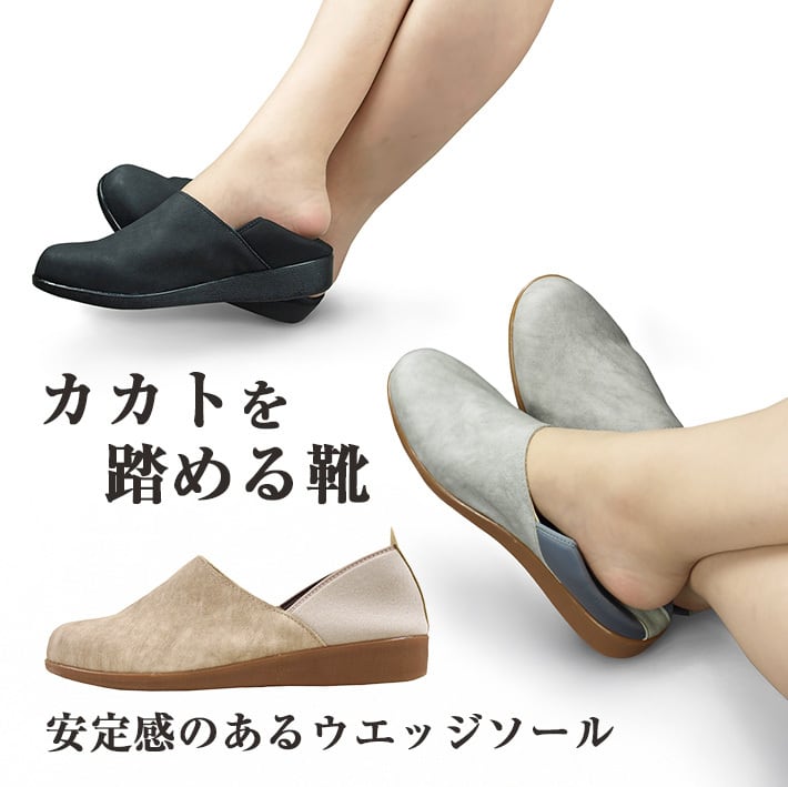 旅行やショッピング、そして乗り物の中など、いつでもカカトを踏んでゆったり気分。いつも玄関においておけば、急な来客時にもサッと履いて対応できる便利さ。